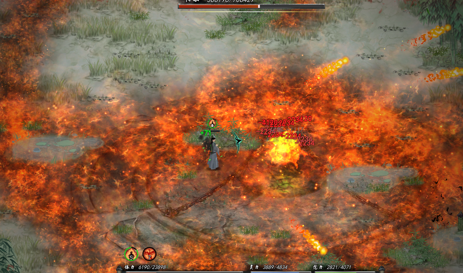 右键离火术,左键无所谓,将自己当成彻底的法师,尽量别靠近左键输出。(这也是火前期打BOSS的最简单方式,离火足够的远),在配合攻击药,以及攻击心法,离火伤害打全,只要不遇见连续的苦,是能够将其带走的。