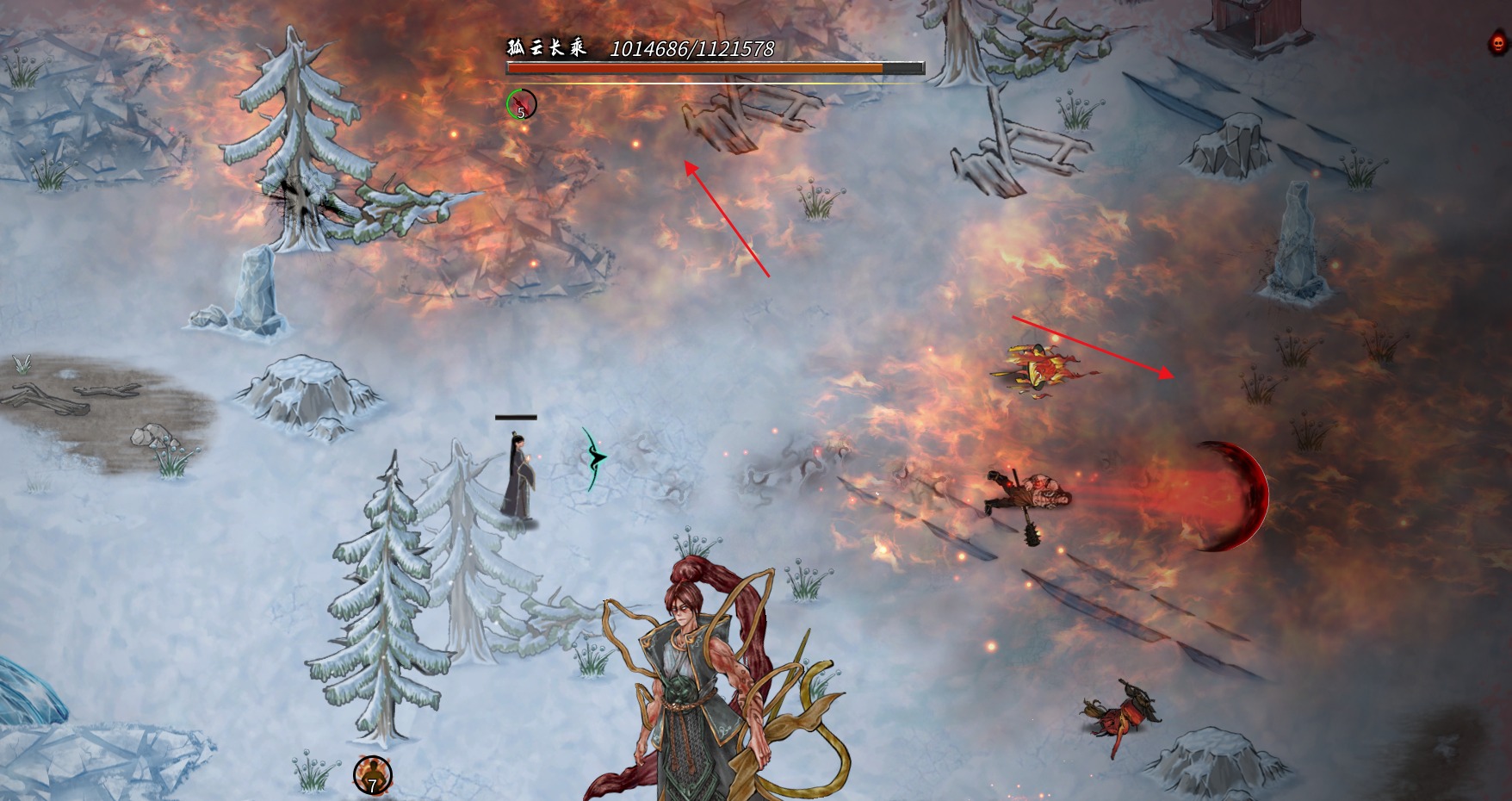 打法技巧:孤云长乘的范围火焰从结晶的3个变成了2个,这一点的好处就是给了自己更多的发挥空间(如图所示),依然是可以借鉴尸王的打法,看到长乘摇旗子叫完小怪之后就直接拉开距离,三个范围火释放完之后,再靠近攻击。因为长乘的血量有些多,对于刮痧的职业可以考虑多准备一些蓝药,或者喝酒不要热血沸腾选择森罗万象,通过走位的拉扯打持久战就可以了。