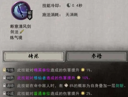 我个人不喜欢剑清小怪的速度所以我选择了这个武法精通,减少武技(平A)的百分之40冷却。低等级的时候是蓝色的。叫武法入门。