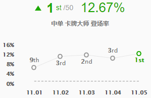 卡牌在11.5版本的登场率达到了12.67%,已经位于版本第一,是最热门的中单英雄!