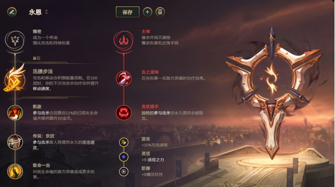 盾弓永恩是韩服主流打法,而盾弓之后直接转饮血是最近很多职业选手喜欢的套路出装。