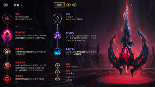 加点主Q副E,岩雀在S11加强后野区刷野速度很快,而且被动靠墙支援队友能力强,前期可快速清空野区,在3级或者惩戒好了之后抓机会打线上先手,利用减速惩戒与E来搭配W,如果队友有先手控制则更好,可以顺利地打出自己的一套爆发并叠加黑暗收割。