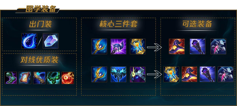出门装选择眼泪或者蓝水晶都可以,第一波回家最好补个戒指可以堆血量,第一件成装先做大天使,但是不是裸出,需要出个章节来配合前期的回蓝。正常发育或者小优势的情况下 ,章节+法穿鞋+护臂或者翠绿屏障(取决于打ad或者ap)+大天使,就是前期的神装。如优势不大情况下,先做炽天使的效果比卢登或永霜要好的多。