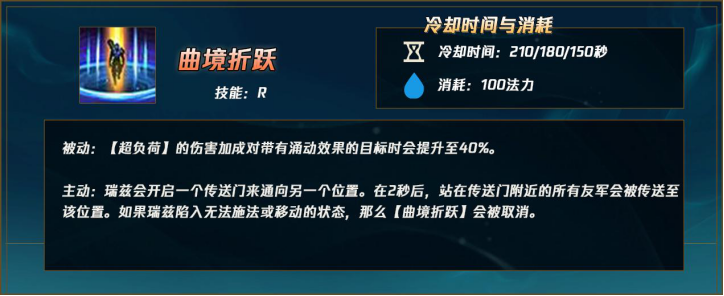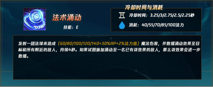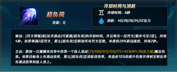 解析:可以充能一次符文,可以用E技能扩散提供涌动效果来配合Q和W