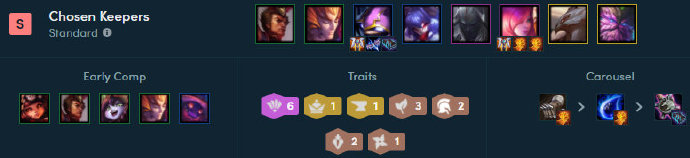 阵容早期可以拿森林、神盾的体系来打过渡,洛、茂凯、璐璐、凯南,4人口的理想阵容,如果在6人口之后有凯南的天选,也可以先上4神盾3森林。这个阵容的早期打法偏向于运营一些,主要的还是后期的4张高费卡,所以前期先看第一轮选秀前的打架情况,如果掉连败,可以大胆的走连败路线,但是不要空城,多观察对手的牌型,来选择适合自己精致卖血的上场阵容,保障自己在连败的同时血量不会掉太多。在6人口之后直接拉升7人口,把主要的搜牌阶段放在7人口。7人口搜2~3费卡的概率比较平均,适合开D牌。