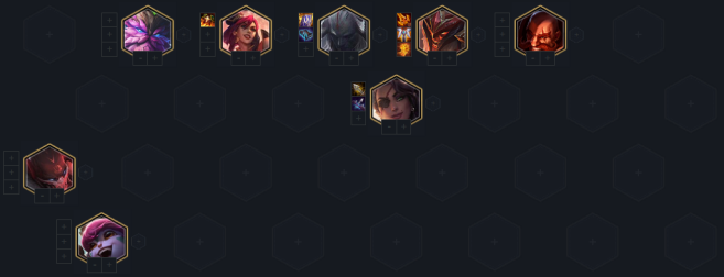 重装拉夫体系是以后期为主的一个阵容,所以前期的运营以过渡为主。选择打工阵容是重装拉夫体系非常关键的,笔者比较建议大家利用版本强势的3/6腥红的体系过渡,虽然现在是走杀人剑拉夫,但是有攻速装有火炮也可以带给拉夫,所以腥红里可以用滑板鞋带拉夫的装备打工。早期抢人口为主,尽早的拉升8人口去搜牌。需要的重装战士是布隆、猪妹、剑魔、布隆、奥恩4张牌,如果有机会上4费卡的猪妹、布隆的重装天选,可以再上一张其他的腥红牌凑出3腥红的羁绊,龙魂小炮后期有条件的话可以换成5费卡的乌鸦,不追3星的小炮能力肯定是没有乌鸦强的。后期注意奥拉夫的站位,整体的输出就很给力。
