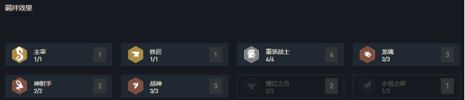 触发效果:1主宰&1铁匠&4重装战士&3龙魂&2神射手&3战神