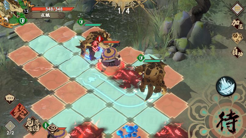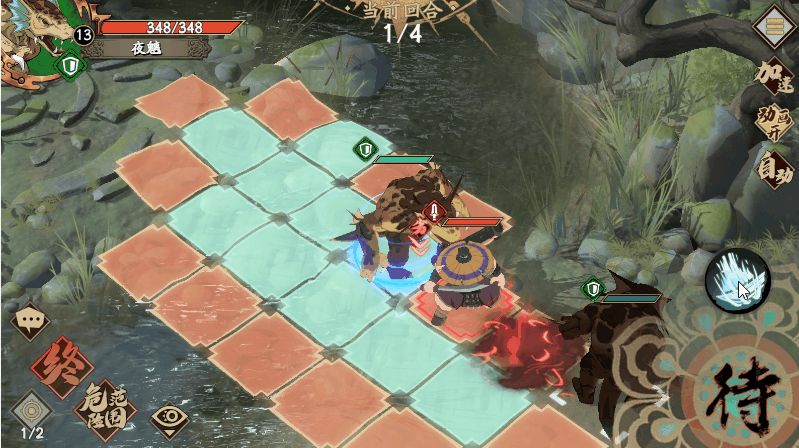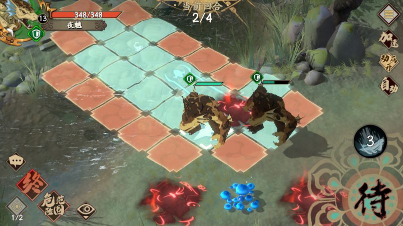 6、残血的己方夜魑走下来,到陷阱右边,这个时候站位就是陷阱边上一边一个,敌方侠客会走到陷阱上来击杀我方残血,回合结束后直接触发陷阱,游戏结束。