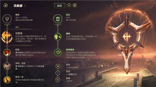 基石符文毫无疑问选择带征服者,搭配的都是标配的凯旋、欢欣与致命一击的组合,可以根据对局不同换成血统或者坚毅不倒。