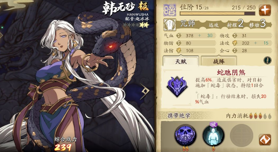 韩无砂的阵法是最平民的阵法之一,妹子阵。无论是主动攻击,还是被动反击,全队都享受对非女性角色增伤效果,想想你推主线时见过几个女性角色吧。至于这个角色本身,他的蛇毒挺不错的,各种范围减益技能也不错。对了,她的蛇毒对boss作用很小,大概只能打个几十到一百血。