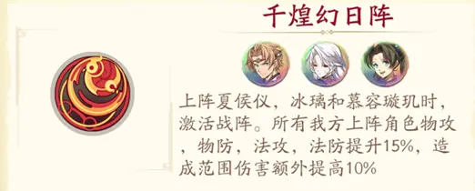 冰璃作为冰系和侠客两方面的输出TOP,如果需要冰系输出无脑练就好了。战阵搭配的话,最理想的是进和夏侯仪璇玑组队的[千煌幻日阵],基本任何非属性本都能使用,三个主角也都很强,可以一直使用。