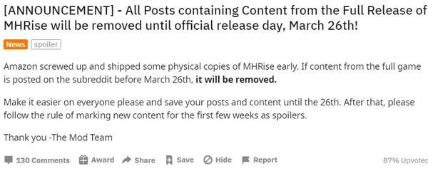 在游戏官方Reddit论坛发布公告宣布所有发布了偷跑的《怪物猎人:崛起》正式版内容的贴子都会被删除,并表示:“亚马逊搞砸了,提前发货了一些《怪物猎人:崛起》的实体版,请每个人都把事情变得轻松一点并把你的帖子和想分享的内容保留到26号,贴上‘首周剧透’的标签再去发布它们。”