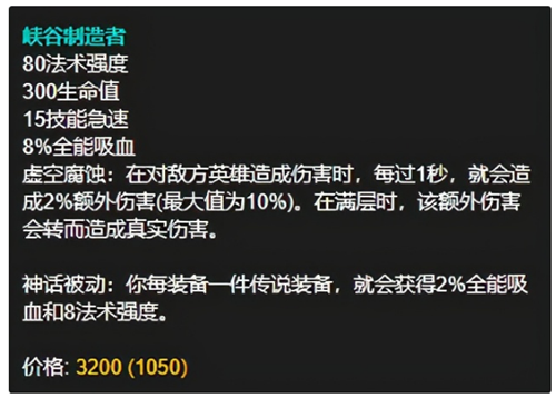 峡谷制造者这件装备增加的属性非常的全面。既有AP加成,还有额外的生命值、8%的全能吸血。而炼金的Q技能在后期只要有足够的蓝量可以一直开着,理论上只要炼金不死就可以将伤害给拉满,配合峡谷的吸血能抗能打,对手毫无办法。而且峡谷制造者的“虚空腐蚀”在对对手造成伤害的时候可以造成10%的额外真实伤害,也就是炼金的Q技能在后期能造成魔法伤害+真实伤害的混伤,不管是针对坦克还是脆皮都非常的恐怖。所以在近期,峡谷制造者的吸血流炼金的玩法表现非常的突出,接下来笔者将给大家详细解读玩法!