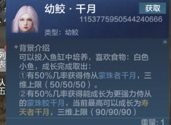 2、有50%几率获得能成长为更强力侍从的蒙珠鲛千月,当前最高可以成长为寿天者千月,三维上限( 90/90/90 )