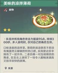 街机cn 来源:厂商 发表于:2021-03-20《原神》凉拌薄荷是1.4版本新增的食谱之一,这是增益类料理,可以在一定时间内提升角色的攻击力,很多小伙伴都想知道原神凉拌薄荷食谱怎么获得,效果如何,下面小编就给大家带来《原神》凉拌薄荷食谱介绍,一起来看看吧!