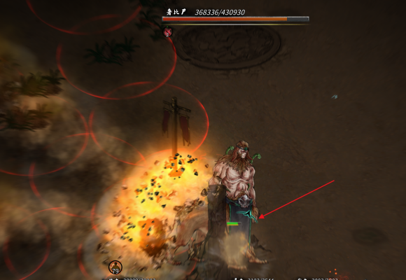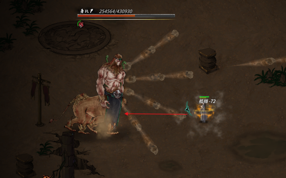 2、如下图所示,如果你是近战可以来到【前蹄子的位置】然后进行攻击,地爆系列的技能可以完美躲避,落石和土弹需要旋转走位,如果你对自己的走位把握不好的话,我推荐你回到1图的打法,就是打几下,到了土弹和落石的技能再拉开身位,到了地爆系列的技能再去贴脸输出即可。