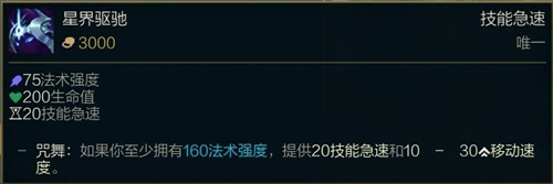 星界驱驰自身提供20技能急速,而当使用者至少拥有160法强后,又能再为其提供额外的20移速以及10-30的移动速度。
