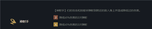 4神射:【神射手】们的攻击和技能会弹射到附近的敌人身上并造成降低45%伤害的3次弹射。
