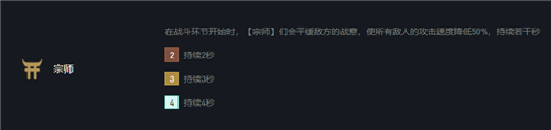 2宗师:在战斗环节开始时,【宗师】们会平缓敌方的战意,使所有敌人的攻击速度降低50%,持续2秒。