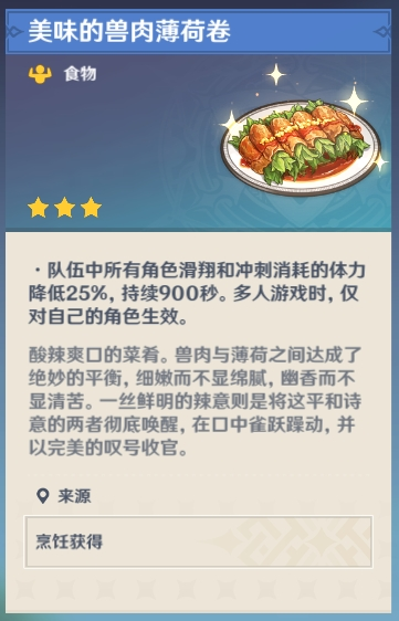 这里推荐没有温迪的旅行者起飞之前先吃一个减少滑翔体力的食物,比如风神杂烩菜或兽肉薄荷卷(亲测够用),菜谱在猎鹿人餐馆可以买到。