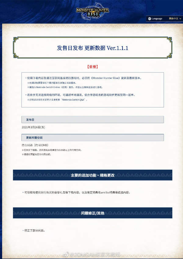 街机cn 来源:厂商 发表于:2021-03-24距离《怪物猎人:崛起(Monster Hunter:Rise)》发售还有两天,游戏媒体评分目前已经解锁,M站均分87可见媒体们对本作的认同。今日,卡普空公布了Switch《MHR》发售日当天发布Ver.1.1.1更新补丁介绍,据悉此次更新内容约为600MB,可领取与使用另行购买的豪华礼包等下载内容。