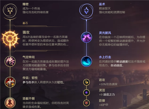副系选择巫术,点出灵光披风和水上行走,这两点是打野的核心符文,灵光披风配合惩戒和闪现打出高额的移速加成,提高赵信的追击能力,水上行走提供河道的额外移速以及自适应属性,提高赵信的抓人能力以及河蟹争夺能力。