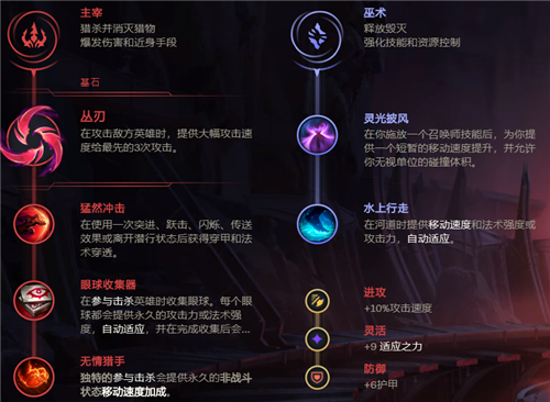 猛然冲击提供双穿效果,配合伤害类型是混伤的AP赵信非常强力,可以完美吃到加成,眼球收集器提供成长的自适应点数,提高赵信的面板伤害,无情猎手提供额外的脱战移速,提高赵信的GANK效率。