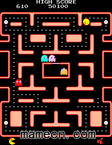 超级经典游戏永远要放到最后~, 那就是「小精灵」的系列作品,以他女朋友为主角的游戏「 Ms. Pac-Man 」。小精灵小姐要通过各种满布圆点与水果的迷宫,同时还要躲避小鬼们的追捕,