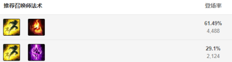 阿卡丽是一个伤害很高的英雄所以引燃这个召唤师技能的登场率很高,达到了61.49%的出场率,上单对线还是主要选择TP,不管是带线还是支援都比较好用,当然如果对方是比较弱势的上单比如AD上单或者天使之流也可以带引燃追求单杀。