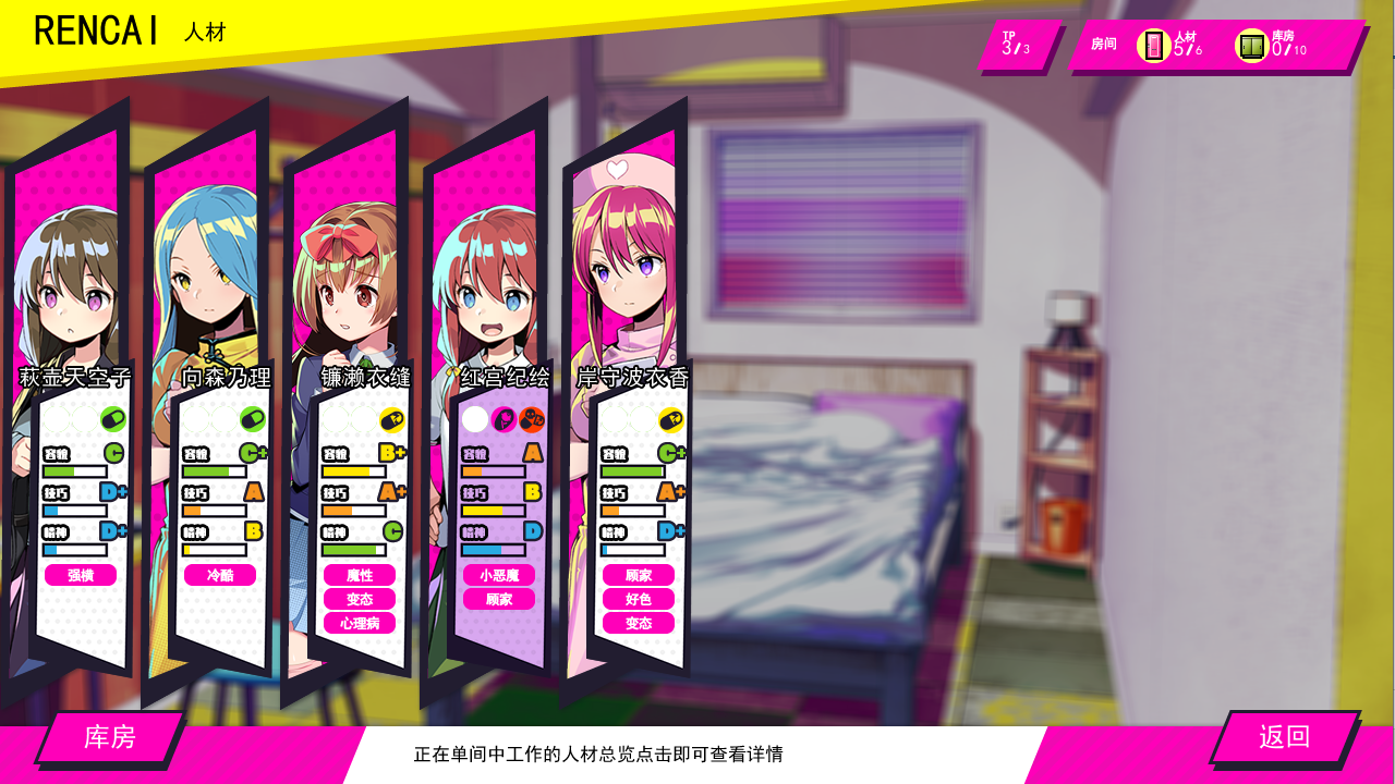 在经营之前一定要先注意妹子的药和心情,药变黄了就得喂(实在没行动力可以先放一放),心情到了D+就注意用道具补充心情。到时候坏掉、怀孕可就难受了,这游戏没有任何方法消除坏掉和怀孕的Debuff,粘上就完蛋了。