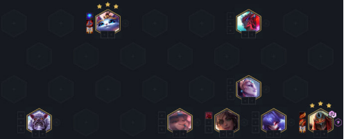 阵容早期的运营就可以走明昼战神、明昼刺客的体系来过渡,早期的三张牌皎月、提莫、劫最好都拿到,有两星皎月的质量可以很容易的稳连胜。但是大家要注意一点,明昼战神劫的体系是让劫主核,劫的上装属于定式,必须要有羊刀、火炮两件套。所以劫的装备成型至少是需要三件攻速装的,所以早期吃太多的连胜反而不利于阵容的成型。一般来说,走明昼战神劫的体系是需要抢6抢7的,劫、悠米都是需要追三的牌。所以早期尽量去凑3福星或者是天选福星打工,保证第一、二轮选秀至少能有两件攻速,这样合成劫需要的定式装就会比较容易。火炮、羊刀都是不可或缺的。一般来说,早期走连败血量能稳定在60~70即可,前期今早拉升人口上7人口,在7人口开始搜牌,重点是搜3星劫和3星悠米就毕业。