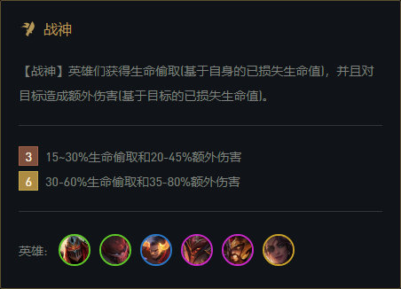 这个阵容之所以强就是因为劫吃到战神的羁绊以后不仅仅能获得额外的攻击力,还可以获得可观的生命偷取,这样劫的出装就无脑冲攻速就行,可以靠战神羁绊打吸血,切到对手后排就是几刀一个小朋友的故事,所以在近几个版本明昼战神劫的体系可以说“经久不衰”!