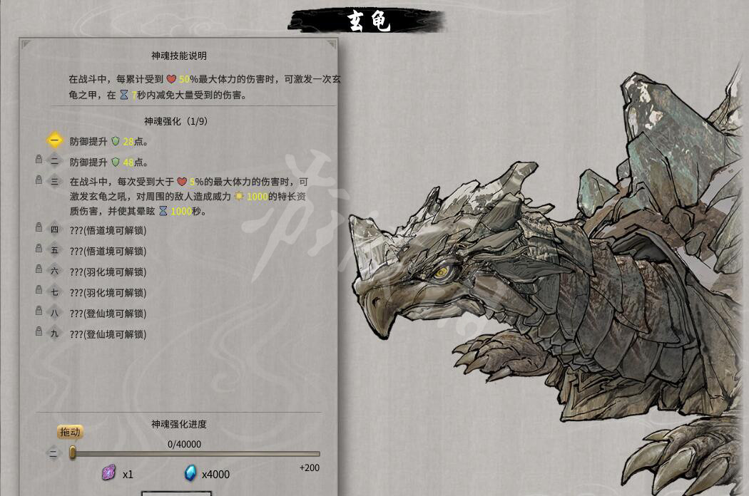 神魂效果:在战斗中每积累受到50%最大体力伤害时可以激发一次玄龟之甲,在7秒内减少大量伤害。