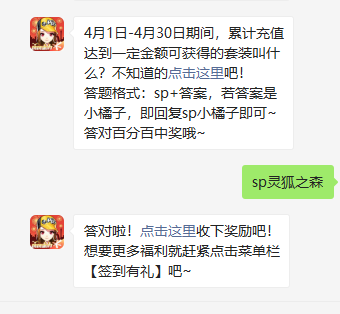 问题:4月1日-4月30日期间,累计充值达到一定金额可获得的套装叫什么?