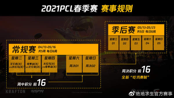 2021PCL春季赛将于4月13日至5月23日举行,总奖金400万人民币,共分常规赛和季后赛两个阶段。常规赛为期5周,适用现行积分规则,以“周中+周决”方式进行,周二、周三、周四为周中赛,周末两日为周决赛,每个比赛日设有6局对决。