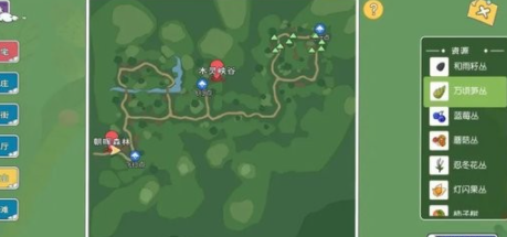 我们在这张地图上可以采集到:柠檬、柿子、蓝莓、蘑菇(夜晚刷新)、灯闪果(果丛附近随机刷新)、和雨籽、忍冬花(果丛附近随机刷新)、万顷笋,地图右边点开资源有分配。