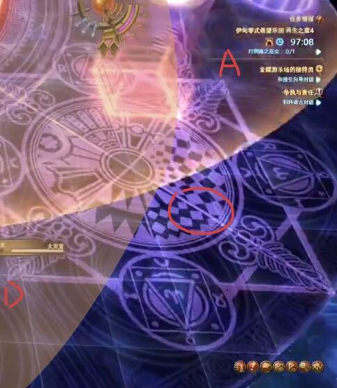 一火开始前建议提前站位,找一个最近的斜点。如图所示,假设是BC之间的斜点。黄圈分别为BOSS跳A点和D点的AOE范围,因此,站在斜点有50%的概率不用动,我认为值得一赌。如果BOSS跳BC点,那就以太步队友,然后大声骂就对了。