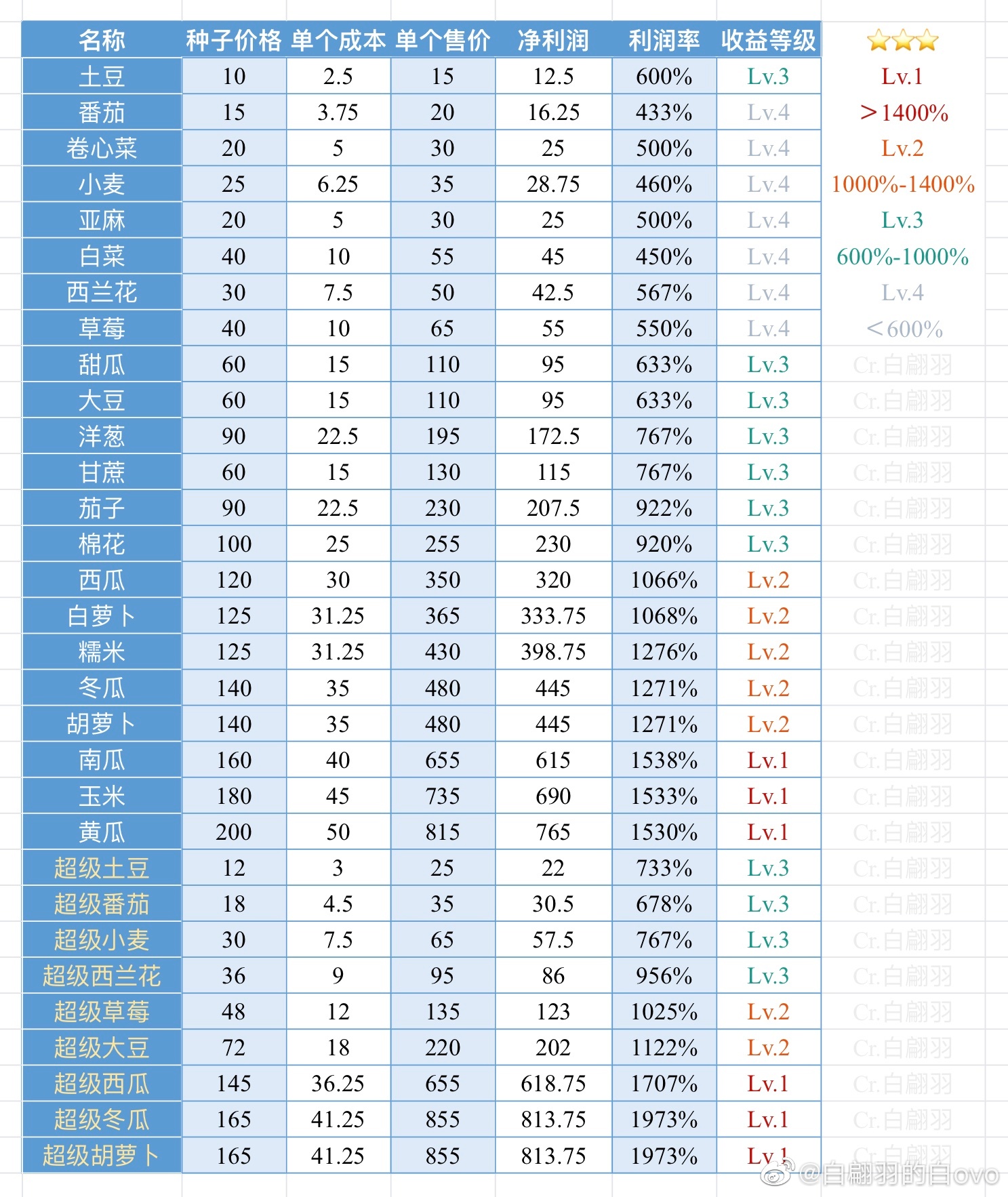小森生活料理及农作物利润表分享