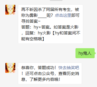 答题格式:hy+答案。如答案是火影忍者,回复:hy火影忍者。hy和答案间不能有空格哦!