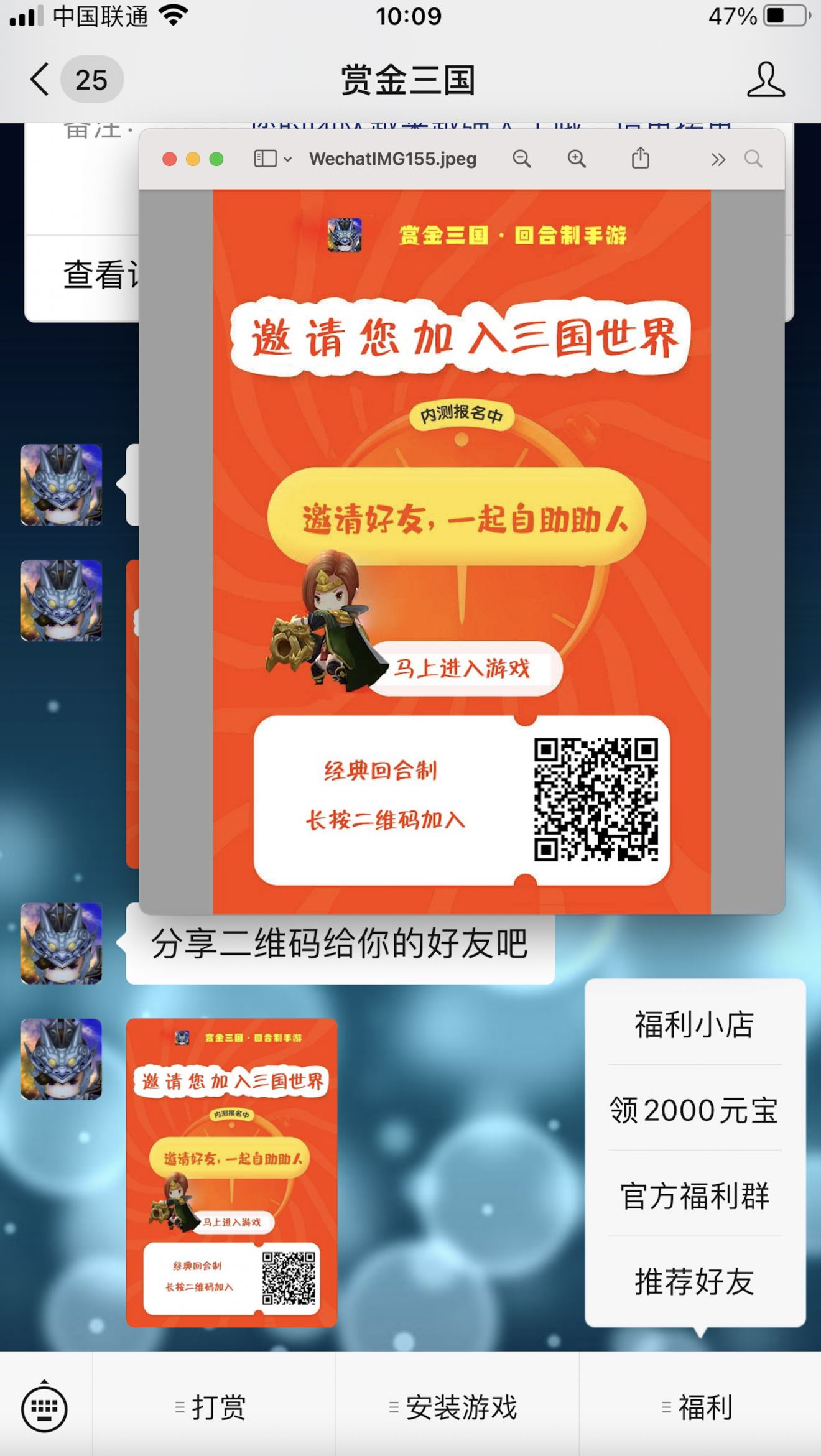 关注赏金三国公众号,领取福利,然后进微信福利群。这是第二重礼包,里面包含2000元宝。