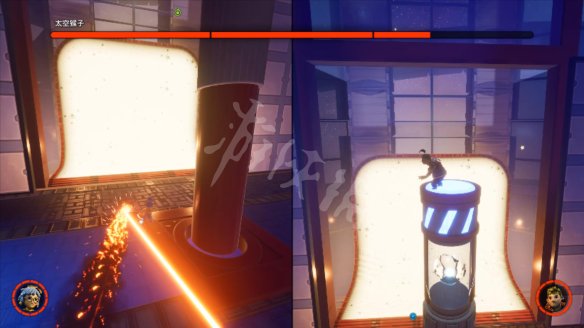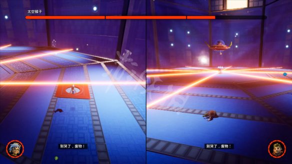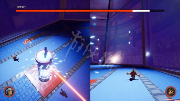 第一阶段需要一个人吸引BOSS的激光,另一人站在机关上等待机关升起后吸引激光的将激光引到机关处。中途猴子会发射激光横扫整个场地。