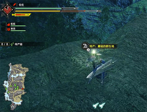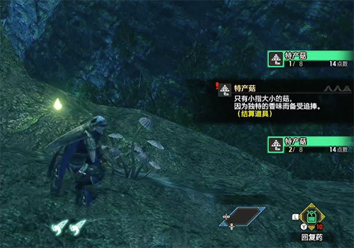 如下图所示,就是这种蘑菇的群生地,靠近之后按A即可采集。最后就能顺利得到特产菇了。