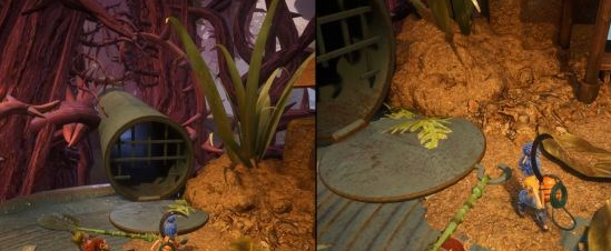 科迪到了最上层后,操作红色拉杆,小梅就能利用另一个台子两人会合了。之后两人会经历一段滑轨。