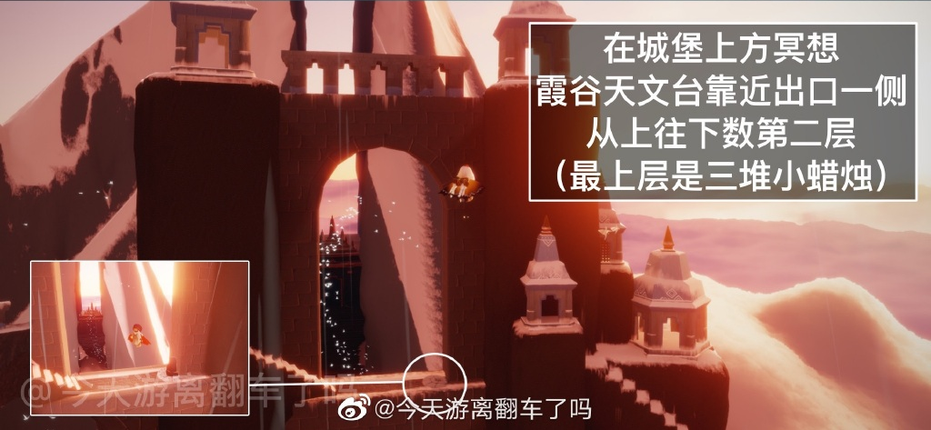 在霞谷的霞光城城堡上方冥想,具体位置是霞谷天文台靠近出口一侧从上往下数第二层的位置,如下图所示。