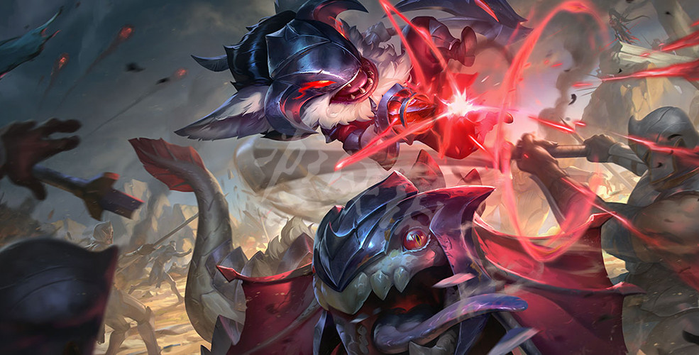 技能:(被动)克烈骑在斯嘎尔上战斗,获得80%最大生命值的护盾。当护盾被打破后,他会下马,短暂地不可选中,并获得50/60/70%攻速并且每第4次攻击造成200%攻击伤害。