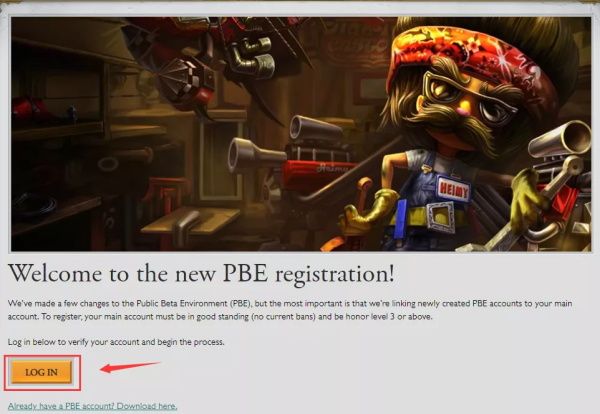 1、然后打开测试服账号申请地址:https://pbesignup.na.leagueoflegends.com/en_GB/pbe(需要用到科技上网),点击下方的黄色LOG IN按钮,