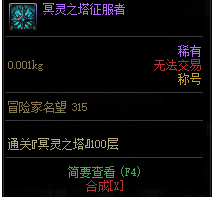 玩家通关冥灵之塔100层即可获得冥灵之塔征服者称号,但是目前冥灵之塔改动的有点恶心,一个就是每周只能打一次,而且需要从头开始打,一旦死亡就会被传出去,所以想一口气打到100层难度还是很大的。