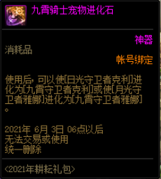 使用后可以使【日光守卫克利】进化为【九霄守卫者克利】或使【月光守卫者雅娜】进化为【九霄守卫者雅娜】