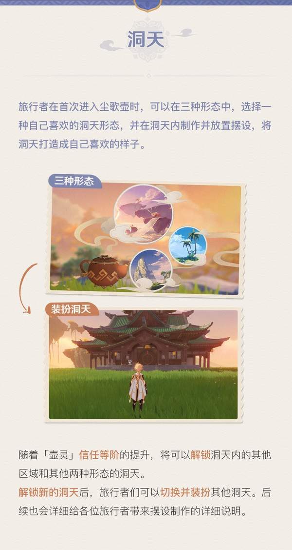 仙人以「尘歌壶」为媒介,凭借仙力化出了此方洞天境地。这盏名为「尘歌壶」的神奇茶壶里似乎别有洞天。作为此方洞天的主人,旅行者可以用各种方式修整洞天的环境,将其变成自己喜欢的样子。