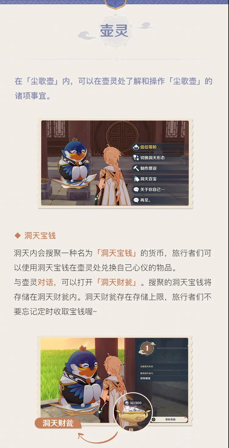 常驻系统「尘歌壶」(家园系统),是仙人送给旅行者的礼物,烟绯在制作壶的过程中也帮了忙。 壶中有一个壶灵阿圆,可以与其交互。